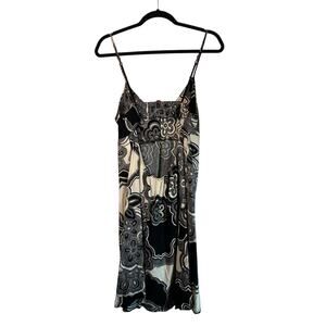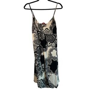 Stand out in this Josie by Natori black and ivory sundress featuring a bold floral print, adjustable spaghetti straps, and hidden pockets for effortless style and function. The empire waist flatters every figure, while the flirty back cutout adds an unexpected twist. Lightweight and breezy, this dress is perfect for vacations, brunch, or warm-weather events. Made from soft, comfortable fabric with great flow and movement. In excellent pre-loved condition. Size tag not shown—see measurements for fit guidance.