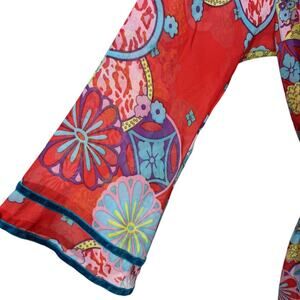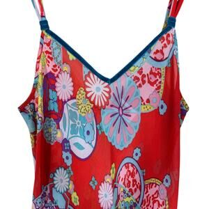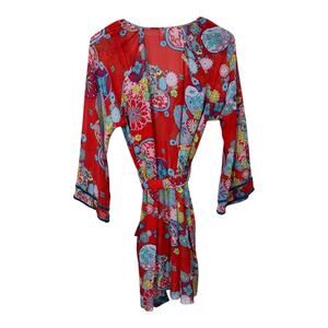 Josie Natori Nightgown Chemise Robe Two Piece Set. Matching chiffon slip dress nightgown and robe set. Red Asian floral paisley print with velvet trim details.
