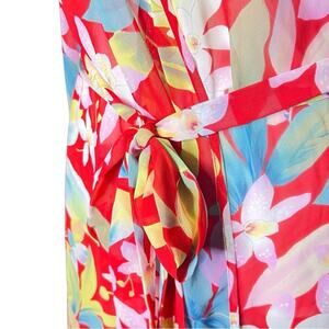 Josie Natori Red Sheer Tropical Floral Wrap Robe M Kimono CoverUp Tie Sleeve