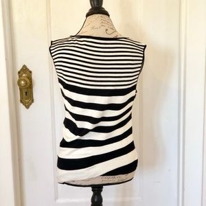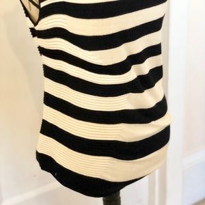 Wonderful Top! Super comfortable! Right side has ribbing for the ruching, that releases to loosen the knit on the left side. Very stylish. Black and white stripes.
