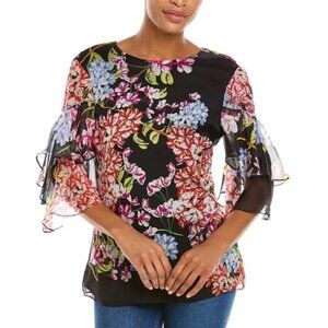 Josie Natori Women Black Multicolor Floral Silk 3/4 Sleeve Blouse Top Sz M