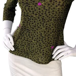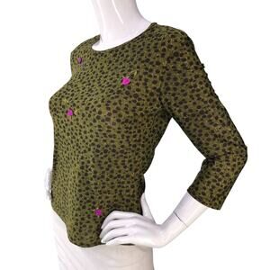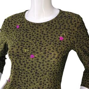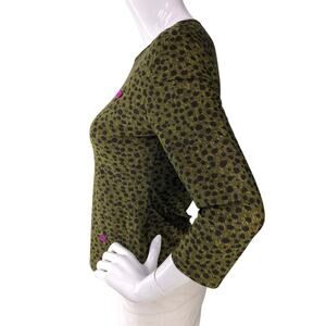 Josie Natori Women's S Olive Green Black Dot 3/4 Sleeve Crew Top Rose Applique