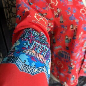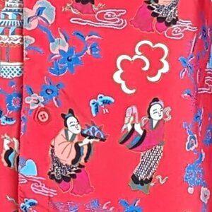 Josie Small pinky red Chinese woman houses printed 3/4 sleeve button up blouse