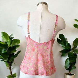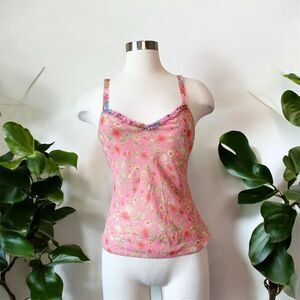 Josie Y2K Sheer Burnout Pink Foral Tank Top Blouse Small Ruffle Floral
