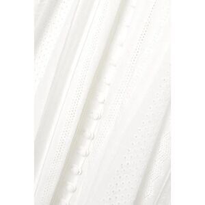 The ultimate warm-weather stunner. This white Julianna maxi dress by Joslin is a romantic showstopper crafted from mid-weight cotton with delicate broderie anglaise and elegant pintuck pleats. The voluminous puff sleeves and plunging neckline create a dreamy silhouette, while the open back with oversized ties adds an ethereal touch of drama. Fully lined for comfort and structure, and detailed with tiny covered buttons along the front.
