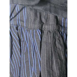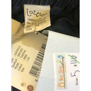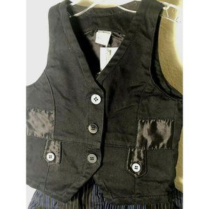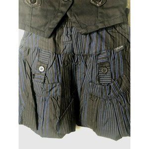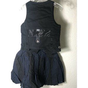Jottum Girls Skirt and Vest Set. Skirt is a 5 in navy and black stripes. Poof design with front pockets. Waist is 20 - 23" elastic stretch and measures 12.5" waist to hem. Vest is a 6 (in my 25 years of a childrens clothing store owner usually sold tops 1 size up from bottoms) in a brushed cotton, with 3% elastaine. Has satin insets, fully lined. Chest: 23"