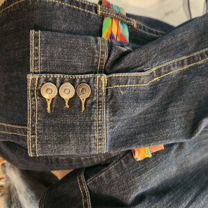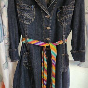 Heavy Denim JouJou button down blue denim dress. Size 22/24. 98% cotton/2% spandex. Two slot pockets with snaps, 3 button cuffs on long sleeves. Armpit to armpit 26"; shoulder to hem 38". Two decorative front breast pockets. Colorful belt, don't know if it is the original belt however it was on the dress when I purchased. Pre-owned, no rips, stains or tears.
