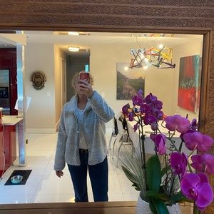 Super soft, snap front, no hood, two front pockets. Crème color with brown-ish lining. Junior size large, but will fit ladies size 4 or 6. Photo of me wearing it attached. I am 5’7” 136 pounds.