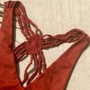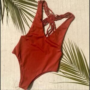 JouesDeSable xRevolve Catherine Clay One Piece is a summer must-have! Size Large and New with Tags. This gorgeous one piece features a plunging neckline with a beautiful, handmade, intricate macrame back detail.