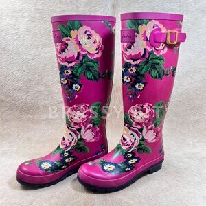 How cute are these rain boots (Wellingtons/Wellies) from Joules?! These are the perfect barn boots that are not only adorable, but will actually hold up. The Sophia Welly is taller, heavy duty rubber soles boot and are fully waterproof. The sole has ample support, has a decent heel, has an adjustable buckle at the top to give some adjustment to the calf fit, and are so darn cute! In a rich pink with multi color floral pattern. Seriously, these boots are absolutely adorable! In hardly worn condition, soles are near pristine. In Women's size 8, are 16.5" tall. Fit true to size.