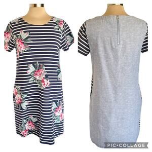 Joules Imelda Jersey Woven Mix Dress Blue Floral Stripe Size 10 Coastal Casual. Sheath style with back zipper, Knit front, woven back. Cotton and linen fabric.