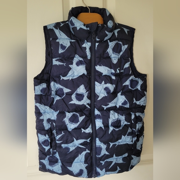 Fun reversible shark and navy puffer vest. Cozy and warm. Perfect for adventurous outings while looking stylish. One of my sons favorite vests to wear! Smoke free home. EUC.