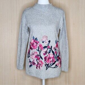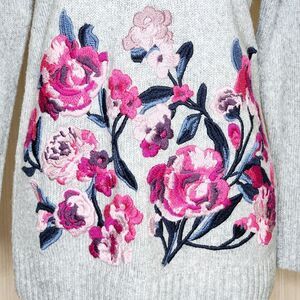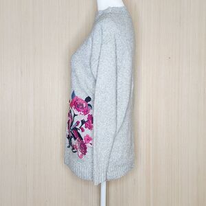 Joules Penny gray marl crewneck knit sweater with pink rose/floral embroidery on front.