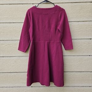 3/4 sleeve A line dress with ponte knit (4 way stretch). Pulls on over the head. In a textured knit. Color is "berry" a pinkish purple shade. In good used condition with no known flaws. See photos for fabric and care details.