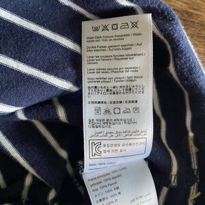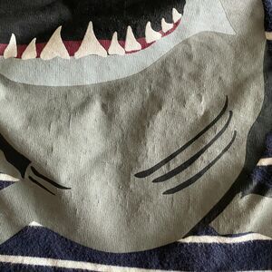 Short sleeve, crewneck, navy blue & white stripes, gray shark graphic on front, glow-in-the-dark diver graphic on back left shoulder.