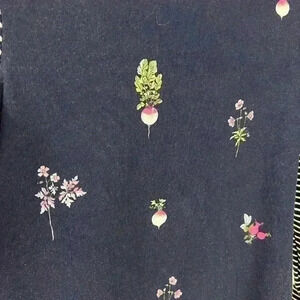 Such a fun top by Joules. Florals, turnips, and radishes on a navy background with dainty stripes on sleeves and back. The fold over neckline is pulling from the bias tape binding on the neck in one small spot (pictured)- this does not affect the look or fit of the garment. From a smoke and pet free home.