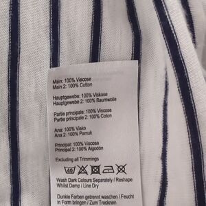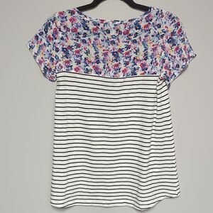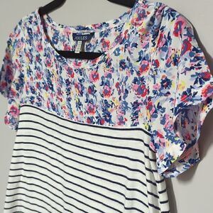 Beautiful florals, blue, pink and yellow. Navy blue and white striped short sleeve shirt