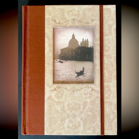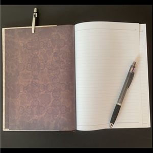 Perfect for the person that loves to write. The spine of the book has fabric and there is an elastic cord that wraps around to close the book. This journal has never been written in.