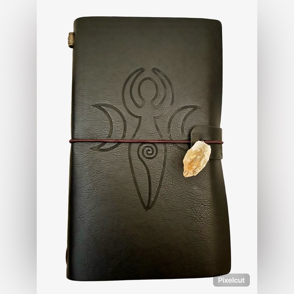 The journal is bound with black leather that has a detailed, embossed design on the front cover. This design is a stunning Moon Goddess, a symbol of blessings, guidance, and grace. The back of the journal contains a section for cards and/or money saving, and a pen pouch.