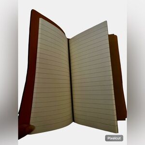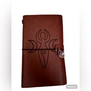 The journal is bound with brown leather that has a detailed, embossed design on the front cover. This design is a stunning Moon Goddess, a symbol of blessings, guidance, and grace. The back of the journal contains a section for cards and/or money saving, and a pen pouch.