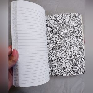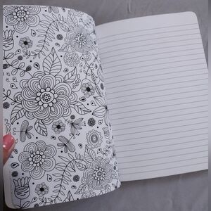 Bundle of two journals. one periwinkle bullet journal with magenta pages filled with little dots. Holographic message on the front to "surround yourself with positive energy". great for gratitude journaling, doodles, or whatever you need. could be good for crochet pattern girlies or crafters who need grids. the other is a Color this journal filled with a mix of lined pages and fun bold patterns that you can color in! great for creatives or meditative processors or just a good lover of some whimsy.