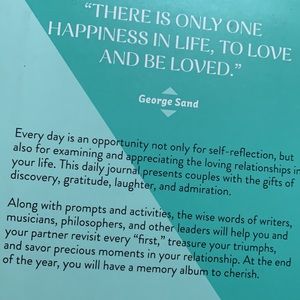 Do One Thing Everyday Together is a journal for two so you can document your amazing, romantic adventures every single day for a whole year! Each page has a spot for the date plus encouraging quotes, prompts and activities to get you going. Not just for newlyweds, this book can help couples who have been together forever rediscover the spark in their relationship! Brand new, never used. No writing inside.