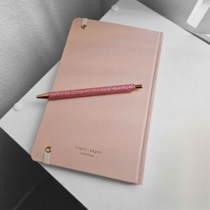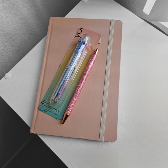 The notebook is from Sugar Paper, the multicolor pen is from Yoobi and the pink glitter pen is just a generic ballpoint pen.