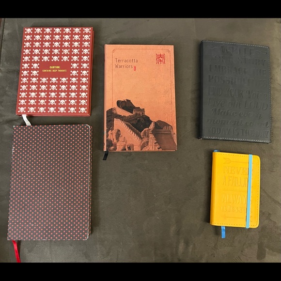 The brown journal on the top right has skull and cross bones print and says “caution: contains deep thoughts” on the front.