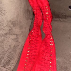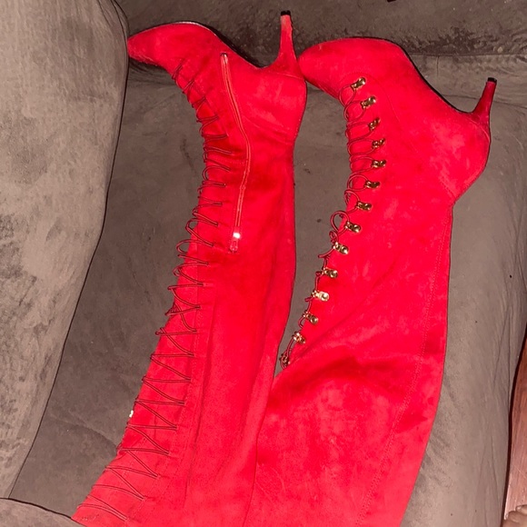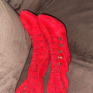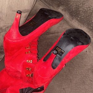 Very beautiful boots look beautiful with skinny jeans on the left heel a small chip of the suede is missing a great price for these boots only worn three times Comes in original box