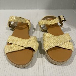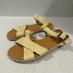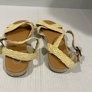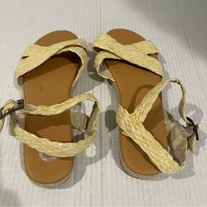 Stylish cream sandals with braided straps. Comfortable flat sole. Adjustable buckle closure.
