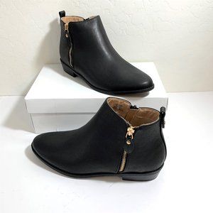 This bootie features an inside zipper with an outer decorative rose-gold zipper detail and a perforated pinhole texture on the heel.