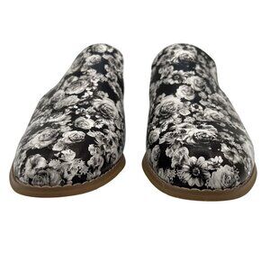 womens floral mules black white shoes slip-on mules casual women shoes open-back footwear JC shoes women size 7 mules PU floral mules TPR sole shoes black floral shoes chic casual shoes floral slip-ons comfortable women mules