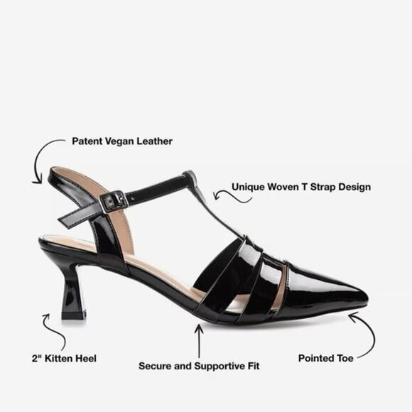Chic black patent vegan leather pumps with a unique woven T-strap design, pointed toe, and comfortable 2” kitten heel. Secure and supportive fit. Perfect for work, special occasions, or an elegant night out.