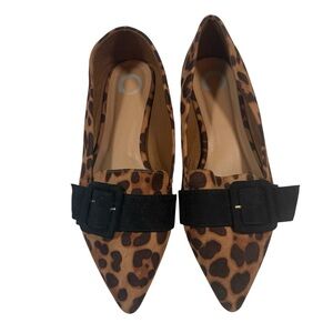 Stylish leopard print flats. Features a bold black bow. Perfect for casual wear.