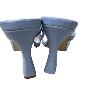 Features a modern square toe, light blue faux leather uppers, and multi-strap slip-on mule design. Four-inch flared high heels offer a chic look for dressing up or casual wear.