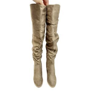 Go for bold in these over-the-knee boots featured in slouchy vegan suede elevated by a block heel.