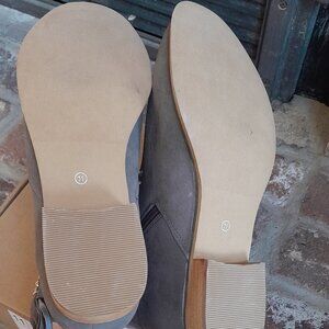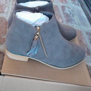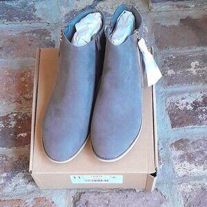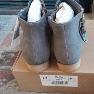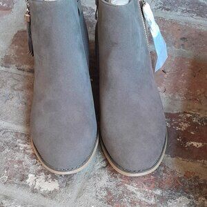 Journee Collection Trista Gray Ankle Boots NIB Size 11 New in Box Premium faux suede uppers rise just to the ankles and highlight a gold-tone outside zipper with a tassel accent. Stacked block heels and round toes finish the design. Product Features