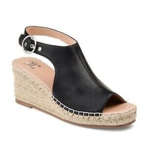 The Crew wedge heel sandal from Journee Collection is perfect for warm-weather elegance with its open toe and a charming exposed back fastened by a round buckle. The simple yet stylish vegan leather design rests on a 3-inch wedge heel that is intricately wrapped in beautifully braided espadrille, accentuated by whipstitch details. Comfort is not compromised, thanks to the padded footbed, making these sandals a chic and comfortable choice for the summer season...