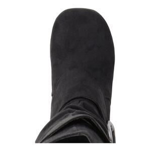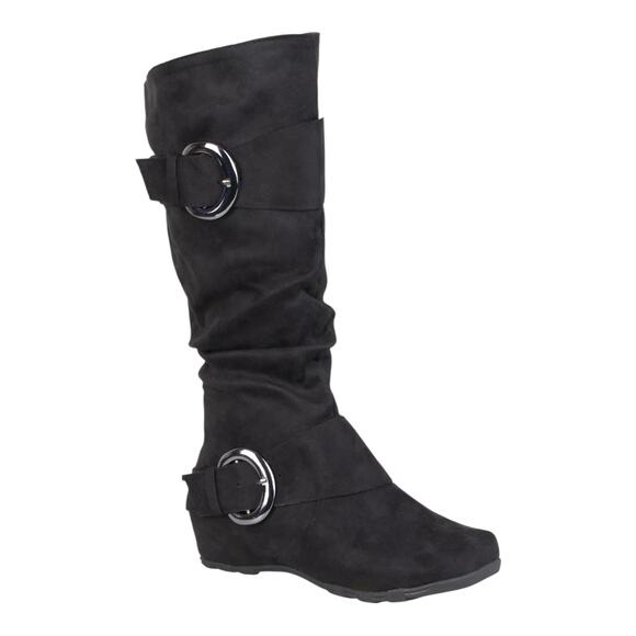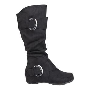 Women's Jester Rouched Buckle Mid Shaft Boots from Journee Collection. These must have winter boots feature smooth faux suede uppers with a subtle slouchy style that rises to a mid calf height.