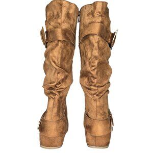 @joeyconte1985 Description: "Step into trend-setting style with flat buckle boots by Journee Collection. These must-have tall boots feature smooth faux suede uppers with a wide-calf design and subtle slouchy style that rises mid-calf."