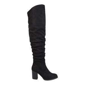 Women's Kaison Stacked Heel Over The Knee Boots from Journee Collection. These ruched over the knee boots are constructed with soft faux suede uppers that rise over the knees with raised vamps that create stylish detail. A rounded toe and stacked chunky high heels finish the design.