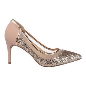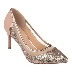 Women's Kalani Stiletto Heel Pumps from Journee Collection. Glitter uppers compliment mesh detail shiny bordering with a patent finish. Faux suede accents the back heels and skinny stiletto high heels complete the look.