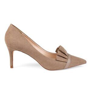 Show off elegant style in the ruffle pump by Journee Collection. These pointed-toe pumps feature soft faux suede uppers and ruffle detail at the toes. Skinny stiletto high heels add the perfect height to this classic pump design.