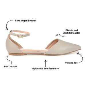 Flats by Journee Collection. Premium faux leather uppers highlight pointed toes and raised back heels with a dainty ankle strap. Padded insoles create a comfortable fit to complete the design. At Journee Collection our flat styles will have you looking just as professional as the boss at work to having the cutest shoes when you go out for the night.