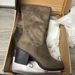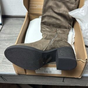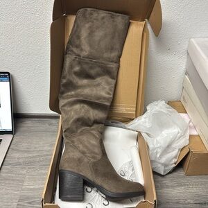 A round-toe over-the-knee boot made with soft and flexible vegan suede uppers finished with a smart zipper entry and a dramatic stacked block heel.