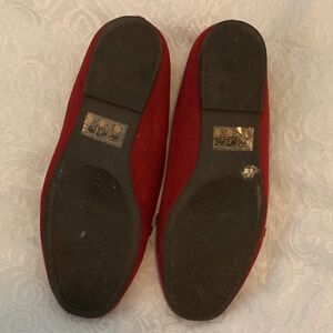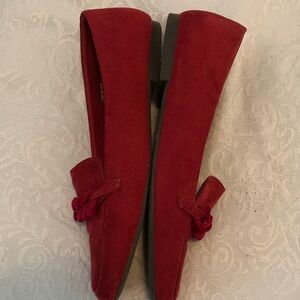 Elegant scarlet loafers with chain detail. Perfect blend of style and comfort.
