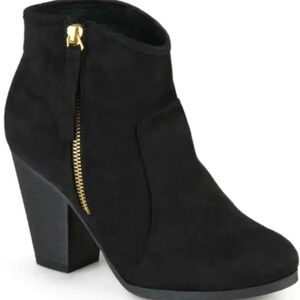 These tasseled pull tops the exposed side zipper of this wide-width block-heeled bootie rendered with vegan suede uppers that are soft to the touch.