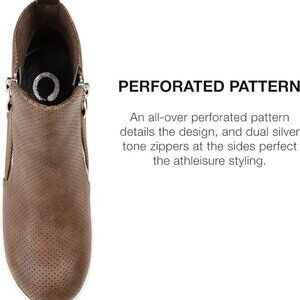 Need a lift? The Pennelope sneaker by Journee Collection features a lofty hidden wedge heel lined with a cushioned footbed for a comfortable elevation. Round perforations cover this vegan leather design and silver tone zippers at the sides finish the look. At Journee Collection our athleisure styles provide basic comfort and will have your outfits looking as good as ever. They will take you from dull to sharp in no time.