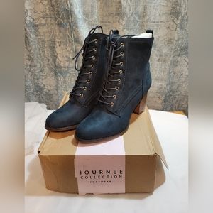 Our take on the military bootie, the Baylor by Journee Collection. This cool style features soft faux leather uppers that rise above the ankles, accented by a classic lace-up closure. A stacked block heel, wide-width footbed, and padded insole perfect the design.