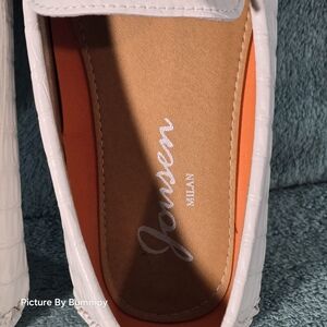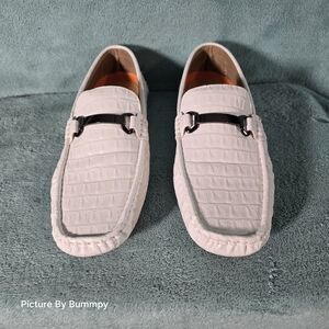 Jousen Men's Loafers in a white crocodile-printed finish. They feature a metal buckle ornament across the vamp.